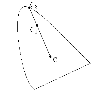 | C corresponds to white light. For a color C1, the dominant wavelength is C2. The purity equals line length (C1-C) / line length (C-C2). The color gamut is the range of colors from C1 to C2. | ![]() |