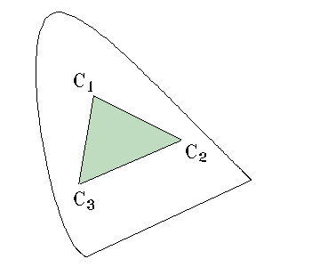 | For three colors, the color gamut is the triangle that encompasses the entire area, so any 3 real colors can't generate all colors. | ![]() |