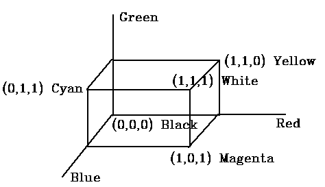 This is an additive model since the phosphors are emitting light. A subtractive model would be one in which the color is the reflected light. We can represent the RGB model by using a unit cube. Each point in the cube (or vector where the other point is the origin) represents a specific color. This model is the best for setting the electron guns for a CRT.