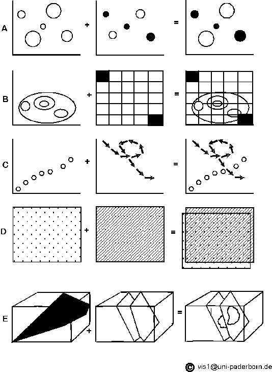 Composition rules are necessary for displaying multidimensional data. They define conditions under which Vista can combine a pair of visualization techniques. There are five composition rules with which you can describe a large amount of composite visualization techniques:(These composition rules are used by VISTA)