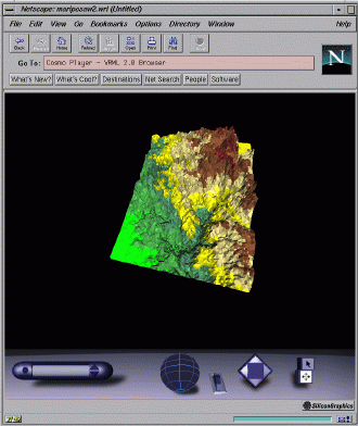 VRML is a newly created programming language and standard for building three-dimensional objects (often called "worlds") on the Web, see: (http://vag.vrml.org/). These 3-D worlds can be viewed on any computer with Web browsers that support the VRML standard. For our efforts, this means that users, especially the general public, with a VRML browser will be able to interact with 3-D displays of spatial and terrain data sets.