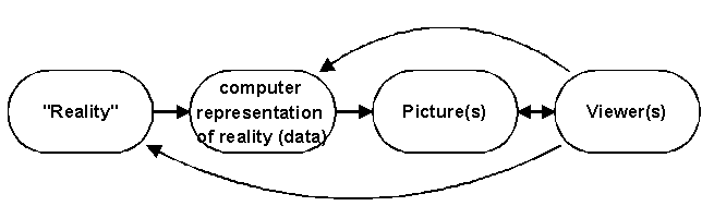 In general, and as depicted by the above figure, visualization is essentially a mapping process from computer representations to perceptual representations, choosing encoding techniques to maximize human understanding and communication. The goal of a viewer might be a deeper understanding of physical phenomena or mathematical concepts, but it also might be a visual proof of computer representations derived from such an initial stage.