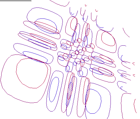 | Lines of constant value (isolines) are drawn. Examples are air pressure on a weather map or constant electron density for a molecular orbital. An interpolation method must be used to generate the isolines. This method was very good for vector display devices. An example of a line contour produced in IRIS Explorer. | ![]() |