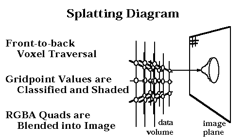 Splatting performs a front-to-back object-ordered traversal of the voxels in the dataset. Each voxel's contribution to the image is computed and added to the other contributions.