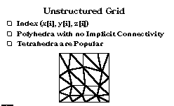 | An unstructured volume contains polyhedra with no implicit connectivity, e.g. cells can be tetrahedra, hexahedra, pyramids, etc. | ![]() |
