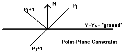 We also need to consider external constraints, e.g., the ground, a wall, etc. Impulse-based collisions detect whether a point intersects a surface, and if so, then it computes the new position and velocity analytically as shown below.