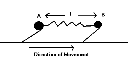 Forces must be exerted on the system to make it move. To be realistic, the motive forces must be generated internally and then the system will use friction and constraints and shape changes to move. With humans, the frictional forces are isotropic, i.e., sliding a foot forward causes the other foot to slide backwards. That is why we must lift one foot to reposition it while the other foot remains static. But snakes and worms remain in contact with the ground and can have anisotropic frictional forces because of their scales. When sliding forward the frictional forces are minimal, but when a body segment slides backward, the scales dig in and the frictional force becomes very large. Below is a figure of a one spring, two mass worm.