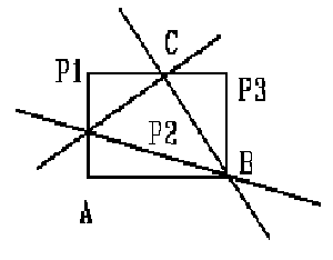 If any of these conditions is true, then P is outside of triangle. Note: This is true for P3, but not for P1. If all of above tests fail (are not true), then must do a generalized triangle_inside test. This is based on a property of the line equation analogous to plane equations. That is, if we put a points coordinates into the equation for a line, all points on the line will have a value of 0 for the line equation, all poinyts on one side of the line will have a value > 0 and all points on the other side of the line will have a value < 0.